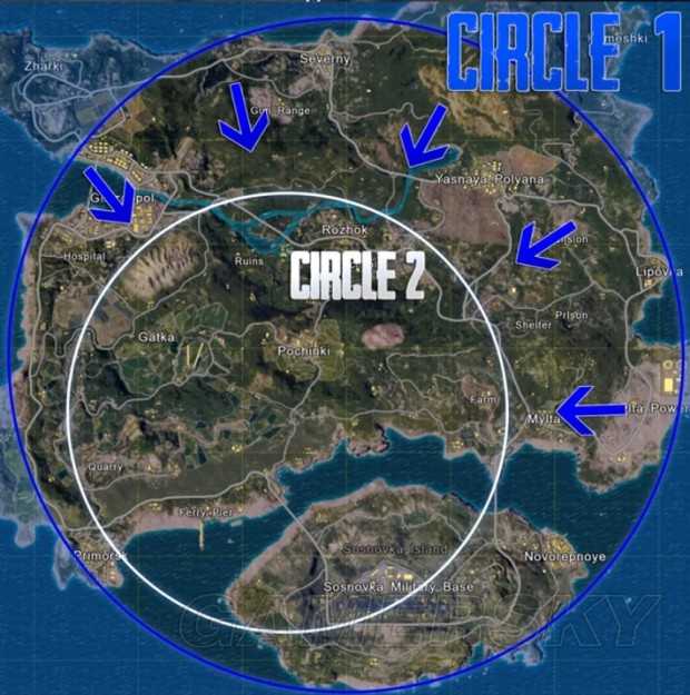 游戏开始2分钟后,公布第一个安全区位置(第2圈)。