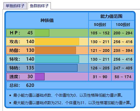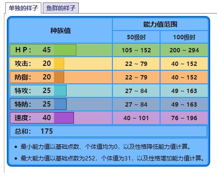 极攻命玉弱丁鱼,队伍之魂,空间下的输出担当,一般作为空间轴的核心选出。弱丁鱼拥有自己的独门特性“鱼群”,其效果是在其hp大于25%的时候可以由“单独的样子”变幻成“鱼群的样子”,这一特性也是取自于弱丁鱼的原形,群聚鱼类——沙丁鱼的习性,沙丁鱼聚集时数量可达到惊人的3亿只。当然形态变化也带来了种族的变化,单独一只弱丁鱼的种族和仅有175,为当之无愧的全pm最低;但鱼群形态的种族和一跃而达到了620,在普双排位中能见到的宝可梦中已经是最高的水平了。一群弱小的鱼类聚集起来竟然能拥有超过准神的力量,这一现象令人感慨,也是我坚持将弱丁鱼这只宝可梦使用下去的原因之一。