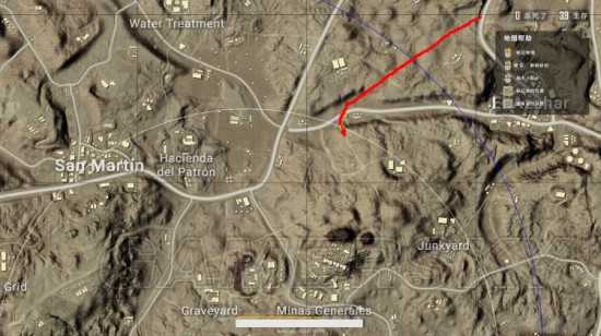 如下图红色箭头则代表了安全进入安全区的正确路线,不经常来地图这一区域的玩家可能还没发现,地图最右边的一条公路是最近一个月版本更新“新修”的公路,最为推荐这一条公路撤离。