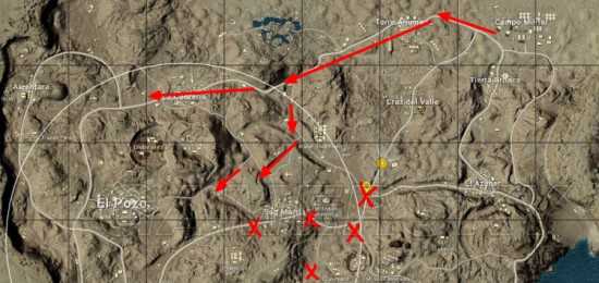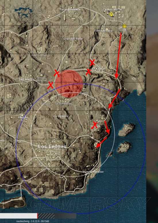 这种情况的安全区的进入是最危险的,危险除了来自于上面几个最容易被伏击的点外,还有就是路过Cruzdelvalle、EIAzahar的时候被城里的敌人骚扰。(由于这种玩法基本是要吃一定时间毒的,所以一定要避免在进入安全区的路上碰到同样跑毒或者还在搜物资的敌人。)下图是安全的撤离路线。(该上山绕路的地方一定要绕,不要图省事!)