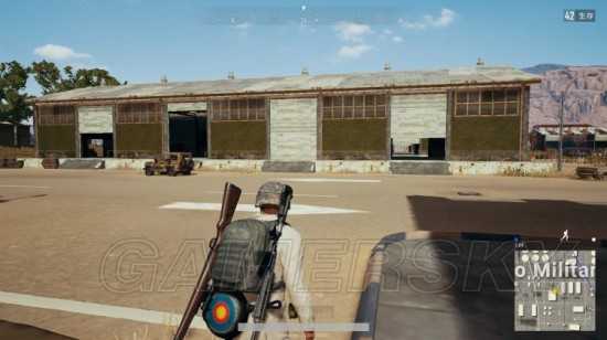 1.红色圈起来的建筑是上图所示白色顶棚的仓库,这个是笔者每次来军事基地第一个来搜也是必搜的地方。切记!大家一定不要记成蓝色圈内的破顶仓库。这两个地方的仓库物资差别还是挺大的。这几个红色标记的仓库是建议单排玩家最先来搜刮的,比较节省时间。四排队伍的话分一名队员搜刮即可。这个仓库具体在游戏里的样子是如下图所示的。(两侧有大门的)