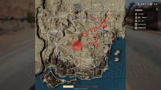 红色×的标记点是高概率被伏击收过路费的地区,切记一定要绕行,尽量避开这几个是非之地。(不止一次从军事基地出来高高兴兴坐着汽车,吃着火锅唱着歌正准备这局吃鸡的时候被扫射下来,这也是对广大玩家的心态进行锻炼。)