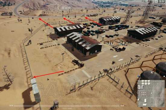 3.尽量从军事基地的右侧撤离,最好不要从军事基地大门撤离,防止被周围打野队伍埋伏。(以后就会讲解如何埋伏军事基地的“一群肥仔”)