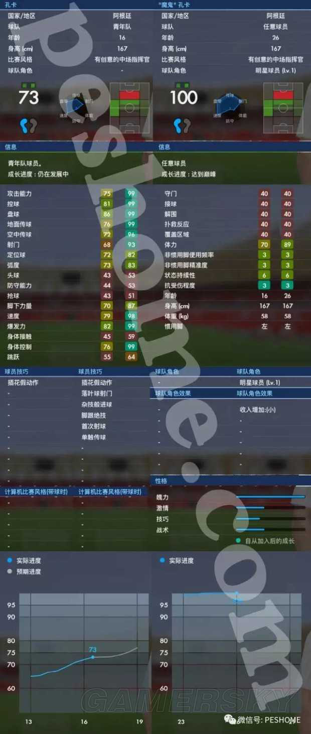 使用评价:孔卡是我们中国球迷一位非常耳熟能详的球星,在pes2017中他转生后练起来效果很不错,但相对于他亮眼的数据来看,孔卡的强大程度好像又低了一点。基本上来讲,能力达到这种程度,那几乎就等于一个传奇级别的矮小型杀手的数据了,但孔卡是个打前腰的,他的盘控和速度虽然都能99,但仍然不是一个前锋的踢法,理论上来讲,这样在攻击端数据普遍上90乃至95的情况下,除了起高球就应该各种秒天秒地,但孔卡在我手里只会禁区外接球抽射破门,其他主要作用是分球,推进和组织都用不上他,所以尽管他的数据长很好,孔卡的成绩也很一般,最终只获得一个明星球员的角色。