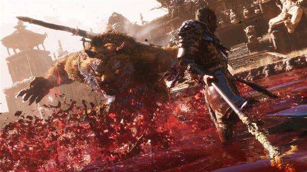 3.近距离:boss霸体变成石头老虎,会格挡玩家的攻击,比较容易在玩家蓄力跳劈后触发。这个霸体后也可能衔接一个boss的替身攻击,血池会闪现水花,两秒后BOSS现身完成一次极快的刀劈,需要玩家判定好时间闪避,伤害较高。