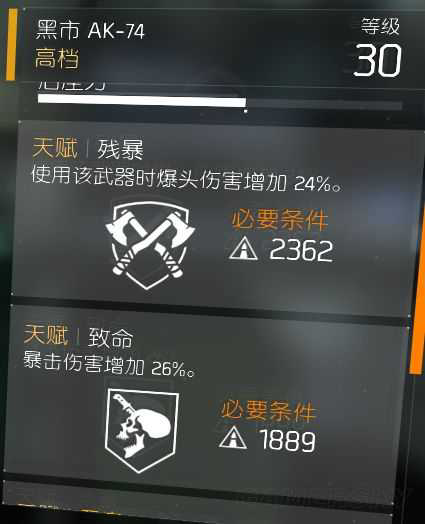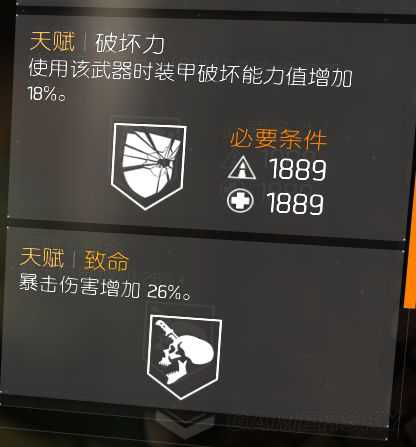 天赋上面的话,致命天赋增加暴击伤害26%是必须要有的,残暴这个天赋的话看个人喜好本人以前玩射击类游戏的话比较喜欢打头,在全境封锁里面的话PVP也不是没有机会打头。