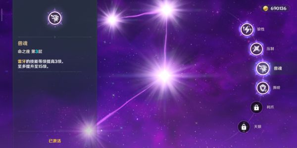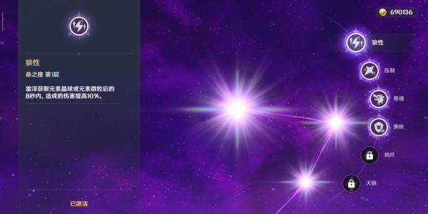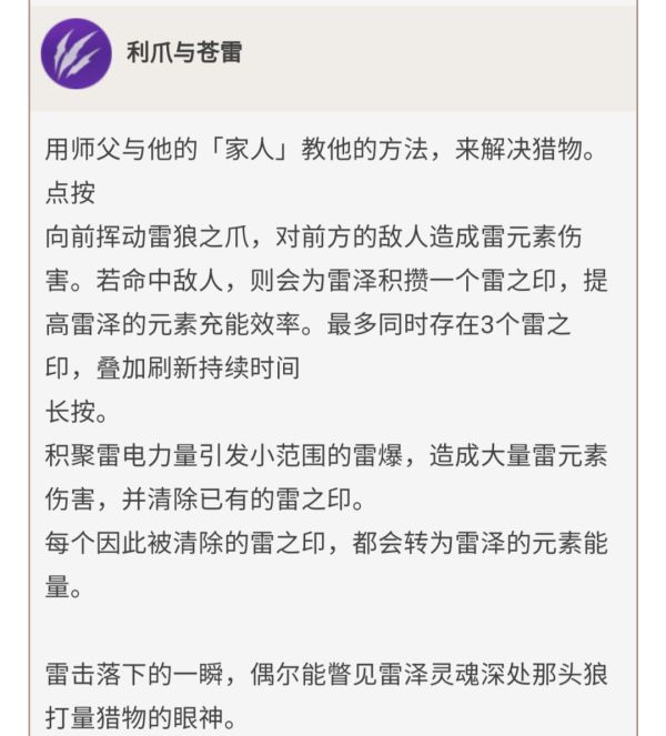 召唤出雷狼,并且造成一次范围性雷元素伤害,此后雷泽每次普攻雷狼都会协助战斗,造成的雷元素伤害,持续15秒。
