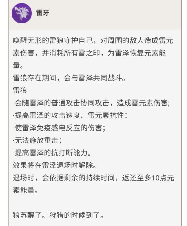 雷狼存在期间,会有大额的攻速和雷元素抗性提升,免疫感电伤害,提高抗打断能力,但是无法使用重击,效果会在雷泽退场或倒下的时候消失。