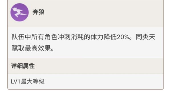 冲刺消耗体力减少20%,非常利于跑图,对于萌新玩家在蒙德探索时来说也是非常的友好。
