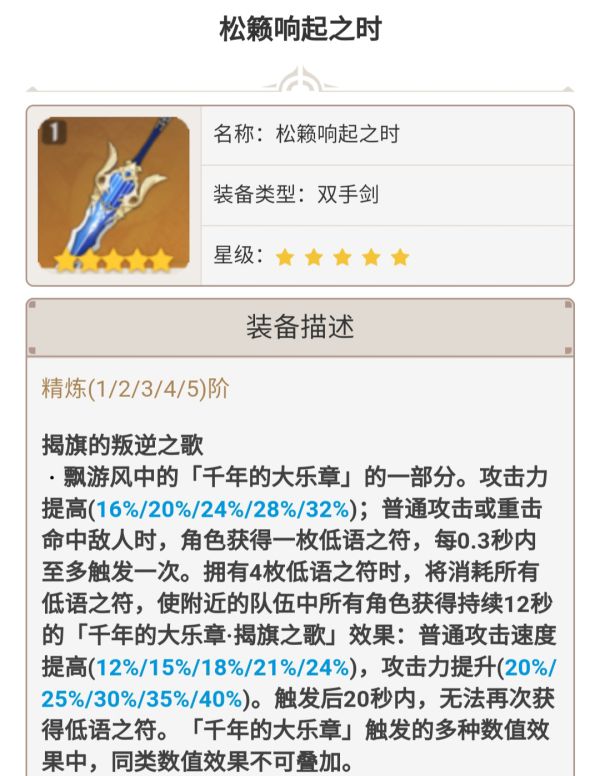 【松籁响起之时】(最优选,副词条的物伤加成,可以说是所以大剑物理角色的专武了,但是松籁都有了不会还有人没有尤拉吧)
