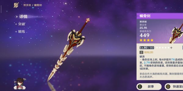 【螭骨剑】(几乎是所有大剑角色的毕业武器,高贵的暴击率加成使角色面板比较容易形成)