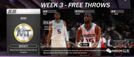 本周的第三个挑战需要对阵黄蜂队,在至少投进8粒罚球的情况下战胜职业难度的黄蜂队,奖励为600MT。