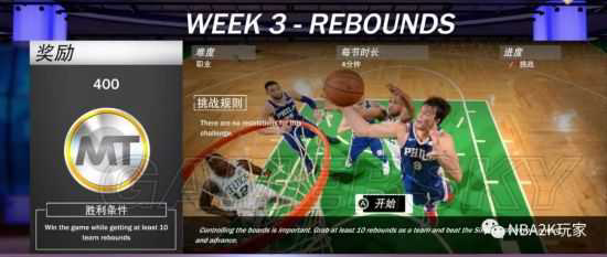 本周的第二个挑战要求是,在整只队伍摘取至少10个篮板的情况下战胜职业难度的76人队,奖励为400MT。