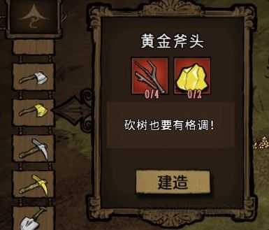 黄金斧头,没有什么好说的就是材料变多了耐久变多了,前期挖矿所得的黄金不要拿来做黄金工具,(万一没找到猪王就绝望了)等做完冰箱,避雷针,鸟笼之后再使用吧。