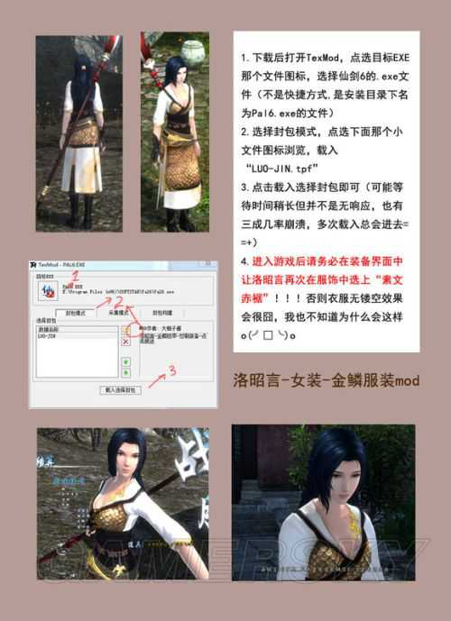 《仙剑奇侠传6》游戏中主角服装实在是少的可怜,今天小编带来“宇智波轮眼”分享的《仙剑奇侠传6》洛昭言金鳞服装MOD使用方法,无论是外观效果还是细节纹理都很不错,当然最重要的是大家喜欢!