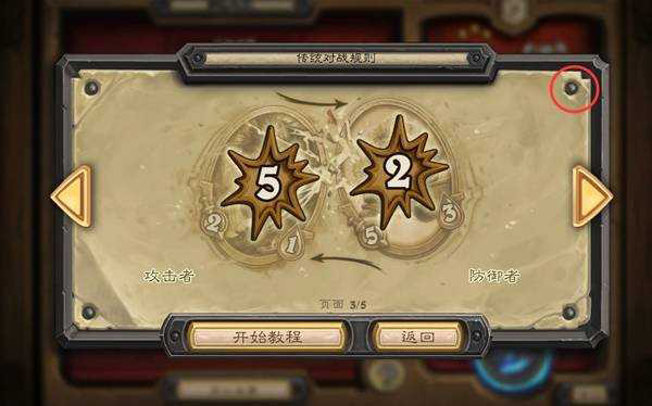 这个成就的谜题入口是在传统对战的界面,右下角的问号进入传统对战规则教程的界面,翻到第三页右上角的这个铆钉进入谜题界面,另外好像冒险模式的问号,然后进行同样的操作也是可以进入这个谜题的。顺带一提,这个成就的提示是“造成2-5点伤害”,本来大伙以为是在训练模式用连环爆裂或者炸弹通过某种手段实现2-5点伤害,结果原来指的是这个页面上的图画啊。