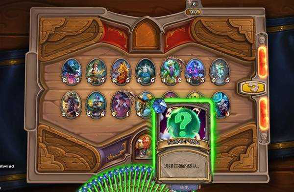 而这个谜题算是比较简单的,就是连连看,你手里有20张神秘法术,法术名字标有一个随从的名字,而场上有14个随从,你只需要把带有正确的名字的法术拖到正确的随从身上就行了,这个对于老玩家来说没什么难度,而且好像是没有时间限制的,只记得绰号不熟悉卡牌名的也可以简单百度一下,基本上都可以一次过。