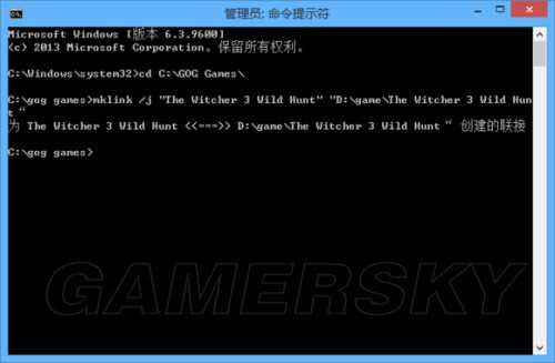 mklink /j "The Witcher 3 Wild Hunt" "D:\game\The Witcher 3 Wild Hunt" (这只是我的巫师3的位置,你需要输入自己的巫师3文件地址)