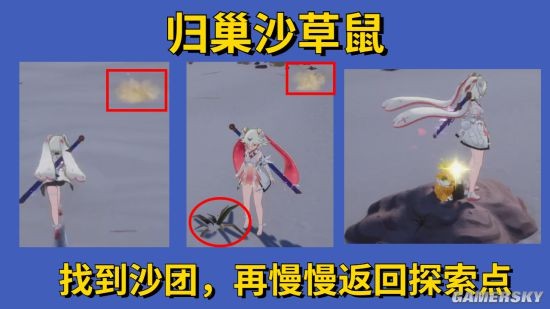 现在还不能看到沙草鼠的样子,只是一推沙子。此时,我们带着沙团缓慢回到探索点就可以啦。