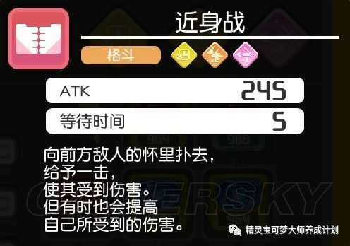 245ATK,5s的CD堪称优秀级别的技能,可以搭载短短石,连连石,多多石。这么好的技能也是有弊端,有时会提高自己所受到的伤害,在正统游戏作品里,近身战的使用会降低自己的双防。