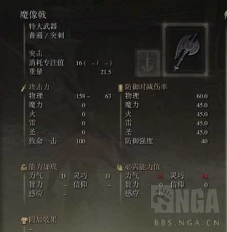 4.武器重量略低于嘎子剑,但是力量需求36(比嘎子剑略高,不过力量号也不差这几点对吧),敏捷需求14;