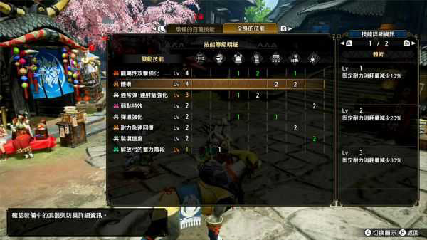 最后配装的关键技能需要有体术(LV4)、连射箭强化(LV3)、解放弓的蓄力阶段、弱点特效(LV2)等等。这套出装的好处是对于装饰品的需求非常低,我们只需要准备一个强弹珠即可。其他的珠子有两种选择,一种是装两个射法珠(弹道强化),可以大大提高接击瓶的有效射程,手感很好;另一张则是用耐回珠和痛击珠将这相关技能拉满。交换技方面,第一个选“刚射”,其他随意。