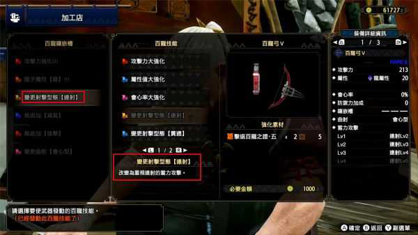 连射的最大优点就是灵活而且输出比较集中,我们掌握了怪物的弱点之后,甚至可以在中距离也能打出极高的伤害!而在武器方面,连射弓的不二之选应该是百龙弓。最初生产出来的百龙弓似乎并不起眼,面板数值不高,不过这玩意有多个百龙强化,强化后就是目前最强的连射弓!