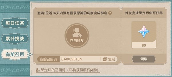 完成有奖召回,可额外获得80原石奖励。
