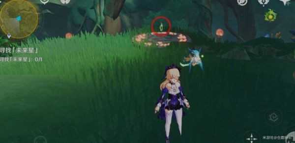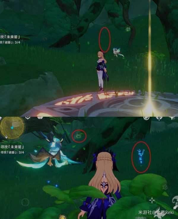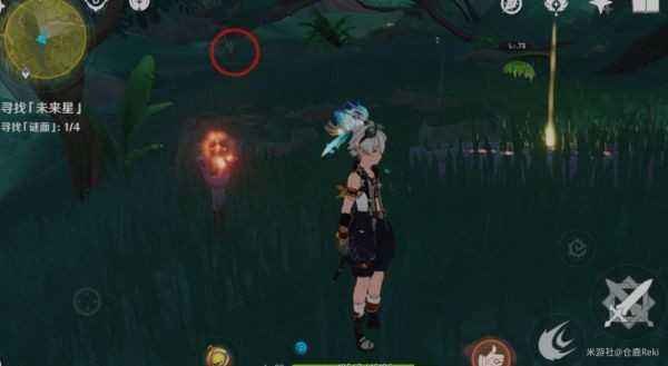 在石盘右前方几个树根下面,往那里靠近,就能看到半透明的火炬,需要用雷元素射中附近漂浮的三乘种子才能显现实物,点亮后会提示谜题解开,未来星出现。