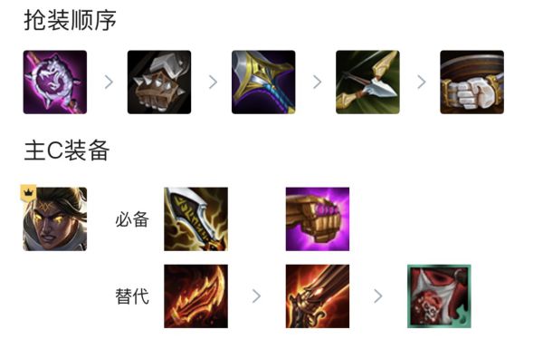 前期装备如果顺的话可以合装备打连胜,主要是维鲁斯的三神装,其次多于的大剑可以给寒冰做基克,魔抗和眼泪可以做圣杯给维鲁斯加强法强。维鲁斯的技能是物伤加法伤。