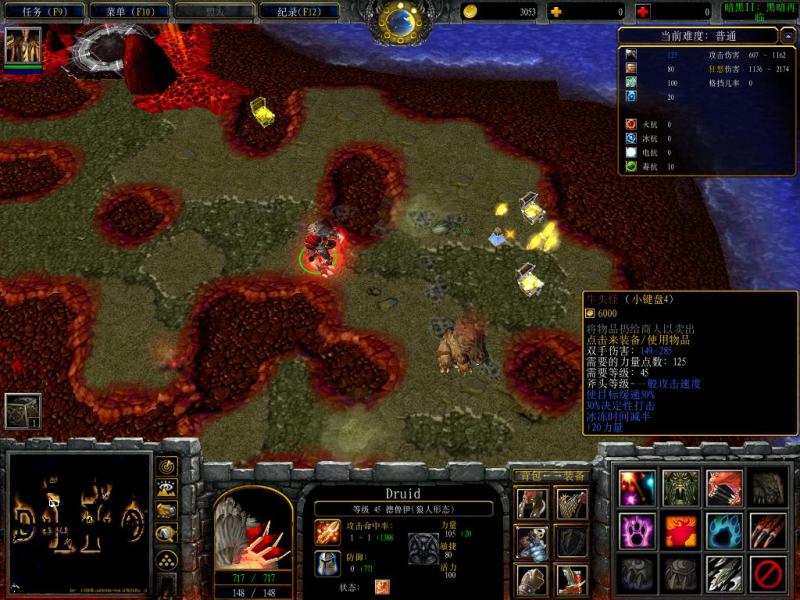小技巧——刷都瑞尔,都瑞尔攻击强悍,不能用双手武器,用单手武器加盾牌,40+的格档,不停吃红,打到都瑞尔剩血皮,存档,暴装备,不好,读挡,刷都瑞尔3-5次,读挡10-20次,运气守护,塔因头盔,地狱瘟疫,暴风公会,毒液牢房等都有了。 第三关,由于德鲁依走的是变形路线,这关很讨厌,特别是薄暮之魂14-64的电伤害,攻击距离远,伤害高,简直是近战职业的客星。由于装备的断层,没有好的电抗装备,而都瑞尔暴电抗75装备是法师双手仗,所以丛林小路有些难度,带上地狱瘟疫,暴风公会,毒液牢房这3个装备如慢慢走丛林小路。如果觉得麻烦,加一点元素系飓风装甲,用人类形态冲过去吧。 这关唯一必须要打的装备是囚房——所有抗性+40。BOSS墨菲斯托很容易打,装备和都瑞尔重复很多,可以略过。 第四关,带上地狱瘟疫,囚房,这关不难,遗忘骑士有反伤,招熊打。大菠萝也好打,我第二次打大菠萝时,游戏弹出,原因不明。 用女巫刷大菠萝没有弹出。这关装备有两个是必要的,谢夫特斯坦布680防,巨大无比56-120攻击。 隐藏关,换上巨大无比,刷地狱牛到45级,满级的狼獾之心,狂怒,这时候血700——800,打第一个隐藏BOSS的时候,打到没血,存档,S/L得到牛头怪——终极武器,非常恐怖。牛头怪参数——149-285物理伤害,德鲁依130力量下,400-700物理伤害,开狼獾之心600-1100物理伤害,狂怒伤害1100-2100,狂怒技能还要乘4,就是4500-8500的伤害,隐藏BOSS抗性很高,物理防御也高,但相对而言,物理伤害比魔法伤害强很多。