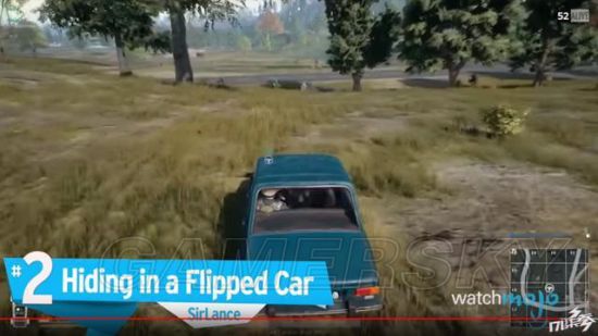 不得不承认老外玩得是666,正常情况下没人会想到可以躲在一辆翻过来的车里(正常情况下你都不可能把车开翻)。如果这样阴到了人当然很爽,但你也可能面临很大的心理压力:万一被看到那岂不是瓮中捉鳖,一扫一个准。所以这正是这种玩法刺激的地方。我还知道有人趴在盒子边装尸体的,听起来更是刺激。不幸的是人趴着和被打死的样子区别很大,所以装尸体的大哥不到1秒就被人看穿。然而后续的发展是对方使出马一样的枪法半天没把他打死,反倒是被他两喷子喷倒了,不得不说世界真奇妙……