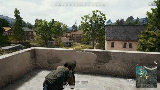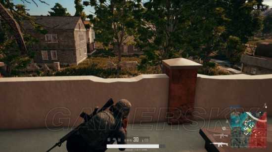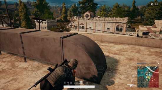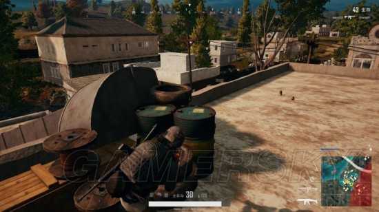 这是大房子的房顶观察情况。这栋楼没有通往楼下的楼梯,必须下到一楼才行。这个楼顶能观察到周围所有情况但容易被敌人远处攻击。不过这里有许多掩体,只要知道了敌人动向,就可以利用好这些掩体,来躲避敌人的子弹。
