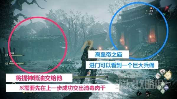 完成步骤1返回天柱山再次与他们两个多次对话,然后前往第二个位置寻找她的丈夫提交清毒肉干。她丈夫出现在第五节主战场「弃身锋刃端」,沿着主路到皇帝庙,不用进门,面对寺庙大门,在左侧有一栋小屋,她丈夫就在小屋里,与他交谈多次会弹出提交精油的选项,将精油交给他即可。