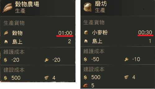 农场60秒生产一个谷物,磨坊30秒需要一个谷物来生产小麦粉,所以理论上建筑数量就是2:1来规划。