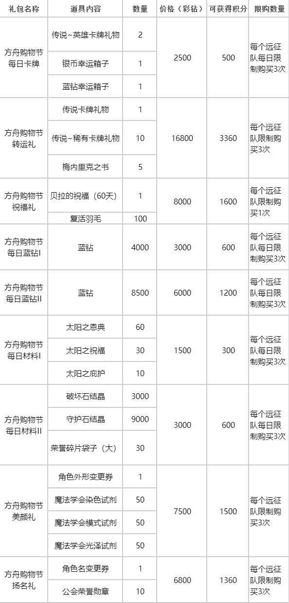 本次礼包以远征队为单位进行购买,购买后道具将发送至商品箱,远征队内所有角色均可领取,礼包详情如下:
