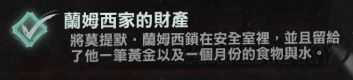 ①兰姆西家的财产:打晕兰姆西后,将他带到安全室里便可。