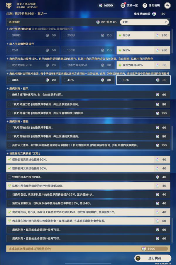 以下为我个人对于获取活动名片奖励需求下理解的「异能」选择(另外选择不克制自身输出属性的敌人抗性),具体可以根据个人实际挑战情况来选择难度和「异能」。