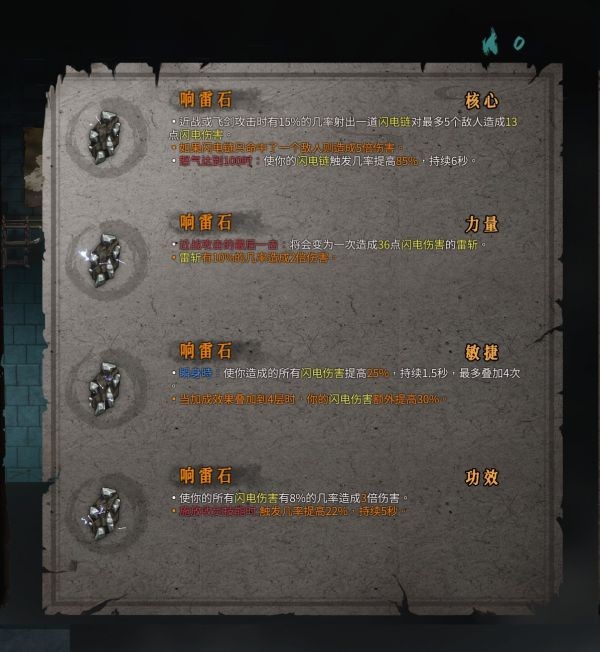 听名字自然雷系的,效果3对雷系左边流派增伤可观,但和踏风草冲突,效果4的暴击伤害不错毕竟雷系就靠闪电伤害,效果2可以配合三色石头。