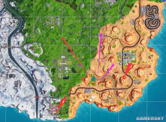 沙漠小镇在幸运码头和棕榈天堂的中间,开局落地只需要注意这两个点的人员数量,在搜索完小镇的资源后,根据开局观察的两处人员多少来确定是以红色箭头来前往致命领域并往地图中部走还是选择紫色箭头前往棕榈天堂附近并前往零售商场附近。