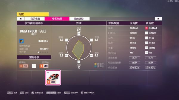 推荐:1993 丰田 #1 T100 BAJA TRUCK,原厂就差不多700分,所以我稍微拉了一下动力就放上来了,效果很不错,虽然是后驱但是无需TCR,不用拉远加速,就在场内跑圈都能过。