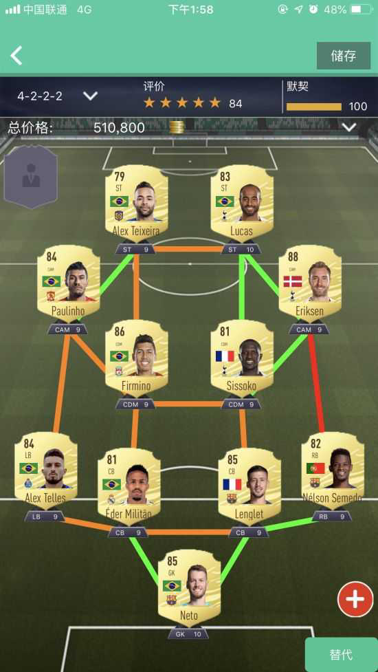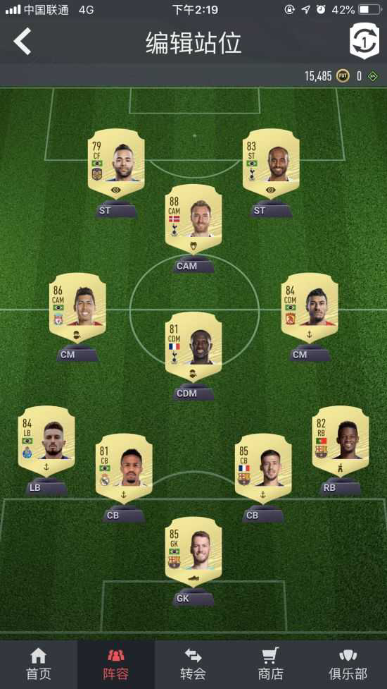 接着来说一键换位的问题。首先,一键换位后球员的化学依然是入场时的状态,不会因为换到不同位置而导致能力的改变。下面我举个例子,如图,我本身想打41212-2,但为凑满所有球员的化学先排个4222,然后让球员吃位置卡(例如费米吃到cdm)把化学凑满,接下来再进行一键换阵的战术板设置。