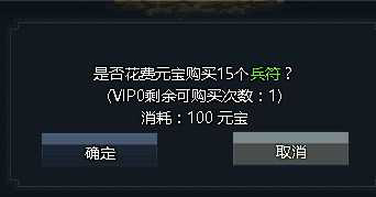 玩家可以通过花费100元宝来购买15个兵符,VIP等级越高的玩家购买次数也越多哦。
