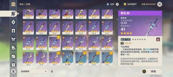 祭礼剑:副词条61.3%元素充能,被动可以进行双E,装备祭礼剑的情况下万叶基本可以保持Q技能CD转好时能量充满,就技能循环而言,比铁峰刺更加适用,不过鉴于行秋,七七也比较需要祭礼剑,可能数量会不太够,而低精祭礼的触发概率较低,冷却CD较长,综合来看还是装备铁峰刺即可。