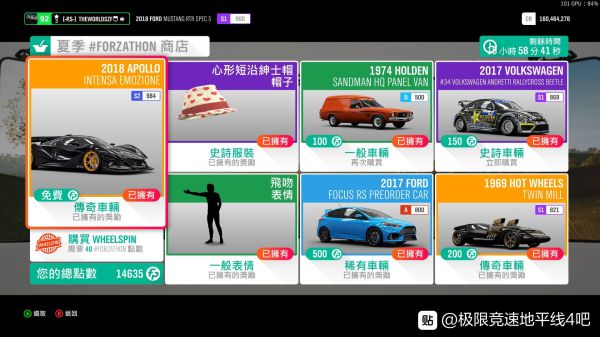 每周每日任务不但可以获得进度,还能获得可以在马拉松商店消费的"点数",这个很重要,是萌新获得稀有车的途径,今天的马拉松商店送奸商们最"喜欢的"阿波罗ie,免费的,还有一辆第一次正常渠道可以获得的福特预购车,收藏价值很高