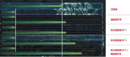 2. 猫的医疗术和体力回复量UP可以叠加,可到体力回复量UP4级的效果,与炮术猫饭和体术猫饭一致。