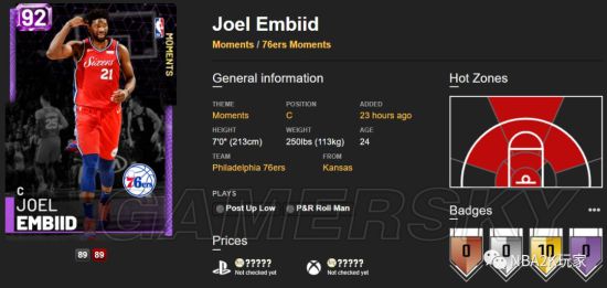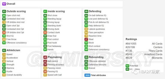 这张紫水晶恩比德的属性总值为3656,六大项中有一项高光(内线得分),四项绿区(外线得分、运动能力、防守能力、篮板)和一项红区(组织能力)。