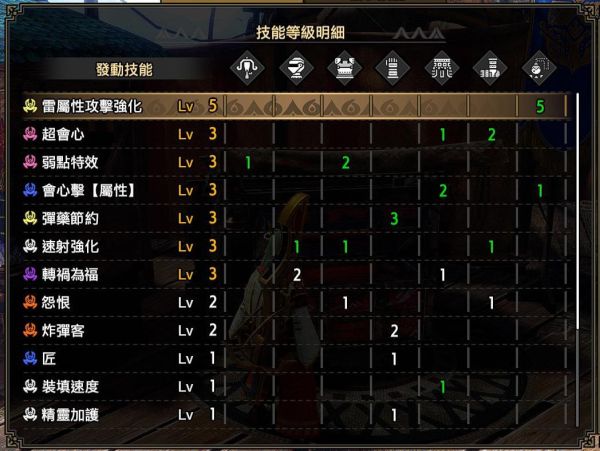 不过基于装备可以直接整套纪录,前面可以先用这把顶四把,后面素材多起来以后,可以再为各个属性做一把有走装走射的,子弹数也比较多,雷->金狮or奇怪龙、冰->远古机武、水->水兽、火->绯天狗,因为这几把洞数不一样,可以在自己去把护石换成更高级的。