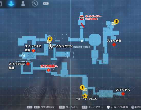 通关后在Treasure中队房间有莉法、西莉卡、莉兹、克莱因的支线,奖励是服装的制作图。西莉卡的支线是去各图清蝎子型小怪,一般能找到。莉法是打新迷宫的加强版BOSS(打倒流程BOSS后可攻略,传送到最深处后有岔路,新开的就是加强BOSS)。莉兹是打新迷宫中的敌对Player,克莱因是新迷宫寻宝(图中以【宝1】标注位置),具体看下图。