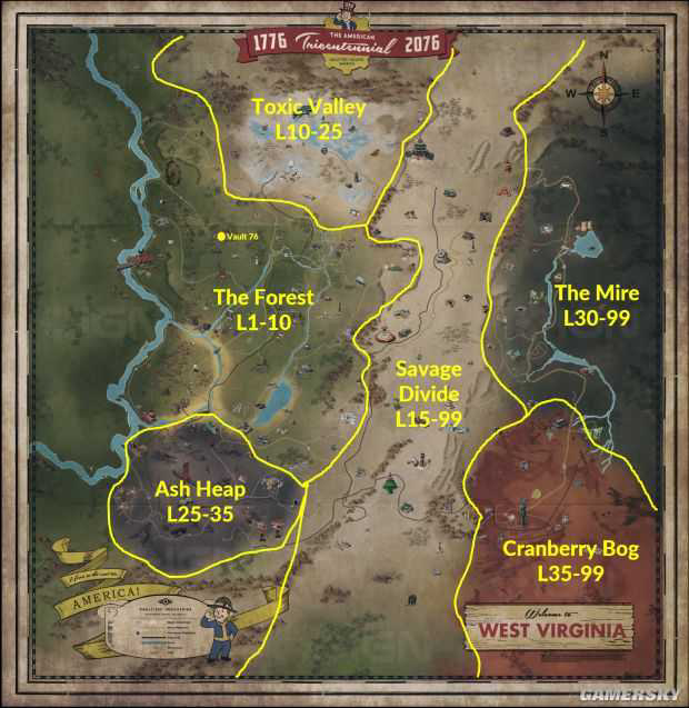 《辐射76》游戏中整个地图都需要玩家去探索,如果等级不够去探索某些地图,可能会有生命危险,今天小编带来“aa2009”分享的《辐射76》怪物等级分布图,赶紧来了解一下吧。